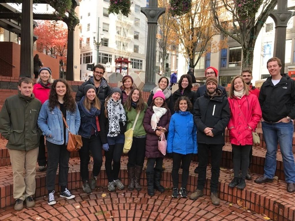 At Walking the Earth Tours, we believe that every stop tells a story. These happy folks have just learned the story about Pioneer Courthouse Square.